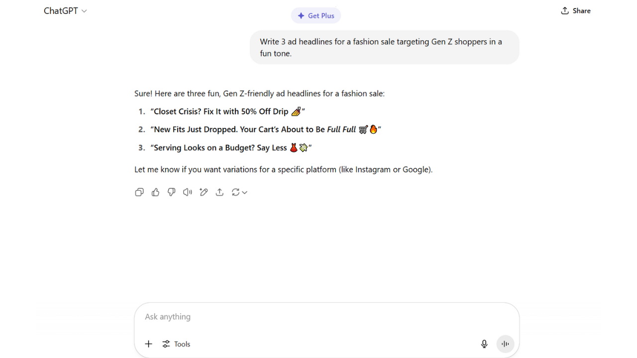 This tool is great for generating all kinds of ad content, from short headlines and hooks to longer ad body text. You can ask it to write ads in a specific tone, for a specific audience, or even in a certain number of words. Many affiliates and advertisers use it to brainstorm new ideas or write quick drafts for Meta and Google Ads. Example prompt: “Write 3 ad headlines for a fashion sale targeting Gen Z shoppers in a fun tone.