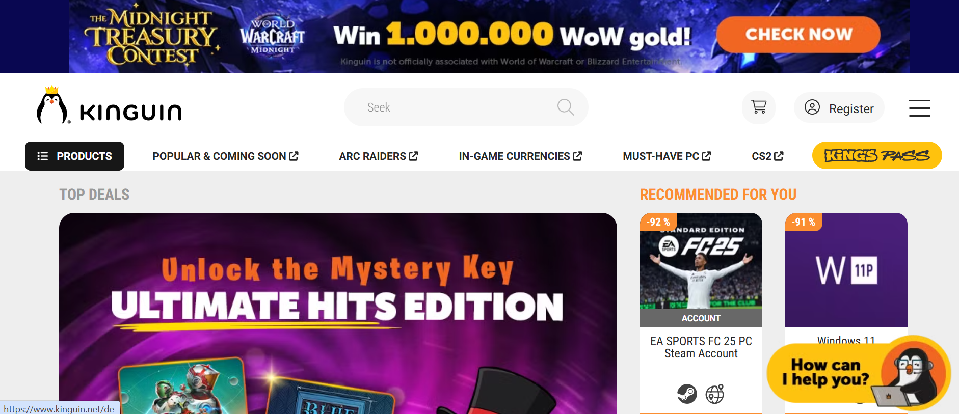 Kinguin is an online marketplace that specialises in software licenses, video game keys, and other digital goods. The site functions as a marketplace where verified merchants list digital keys for games across several platforms, as opposed to a typical game store.