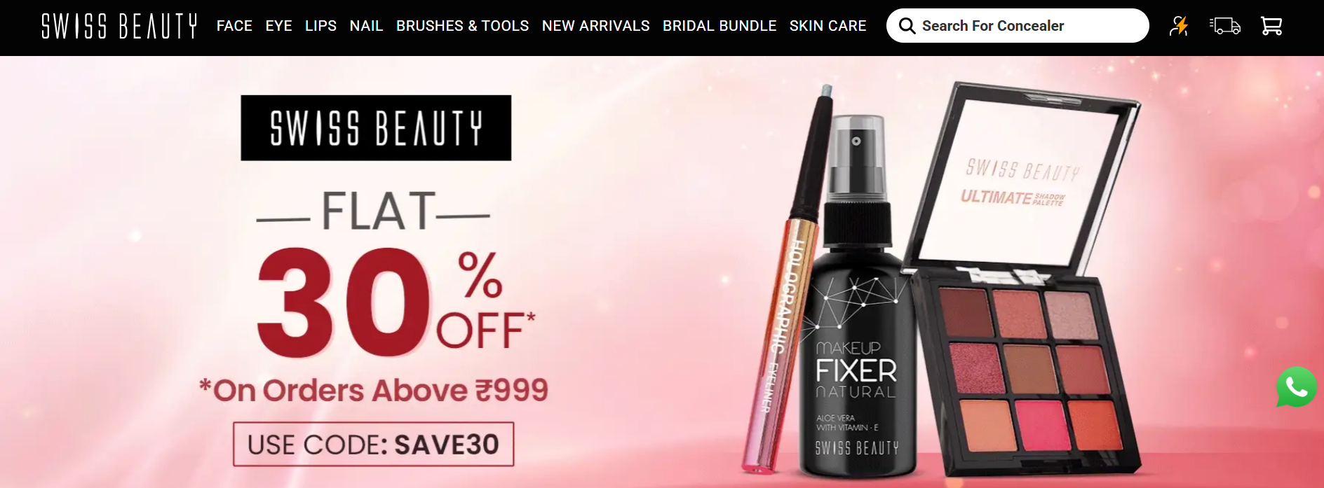 Swiss Beauty is a leading Indian cosmetics and skincare brand known for its quality makeup, skincare, and beauty tools. Right now, the brand is offering FLAT 30% OFF + 30% Cashback on orders worth ₹999 and 3 bestsellers free on orders above ₹799, making it highly attractive to shoppers.