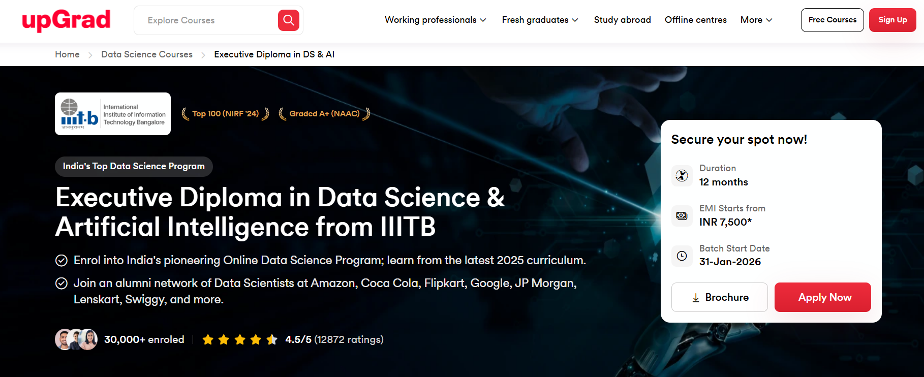 upGrad AI offers professional programs in machine learning and AI. The platform is designed for learners looking to upskill or switch careers. Multiple offers are live on the website, such as earn cashback or vouchers up to ₹80,000, while your friend gets an instant scholarship or free course, which works well for education-focused audiences.