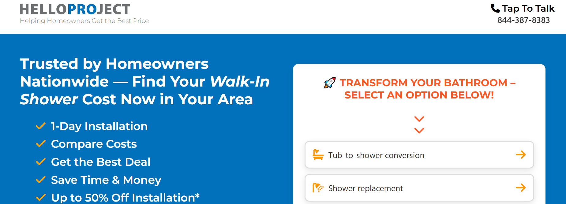Hello Project is a US-based home services website, focusing on home installation services. It helps homeowners explore installation options with discounts of up to 50%. Users share basic details to check pricing and availability, which fits people actively planning upgrades or replacements.