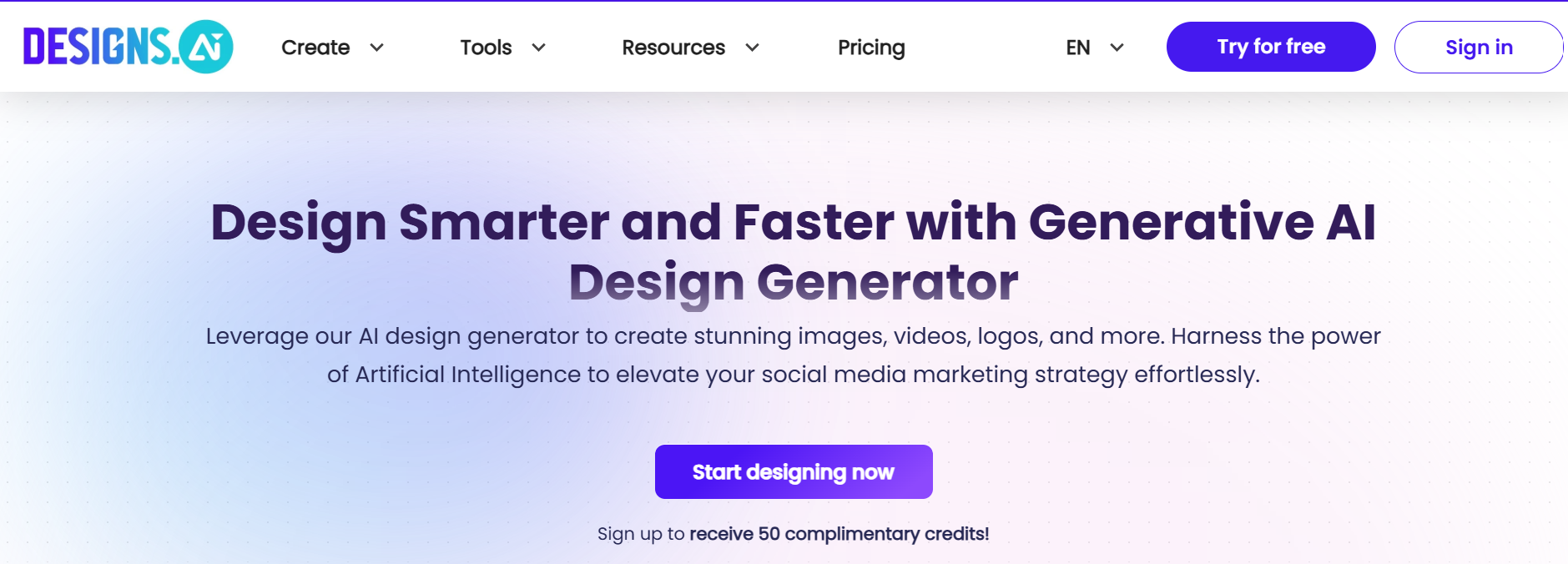 Designs AI is a creative platform used for building logos, videos, and marketing creatives without advanced design skills. New users receive 50 complimentary credits on sign-up, which makes it easier for affiliates to drive trials and initial engagement.