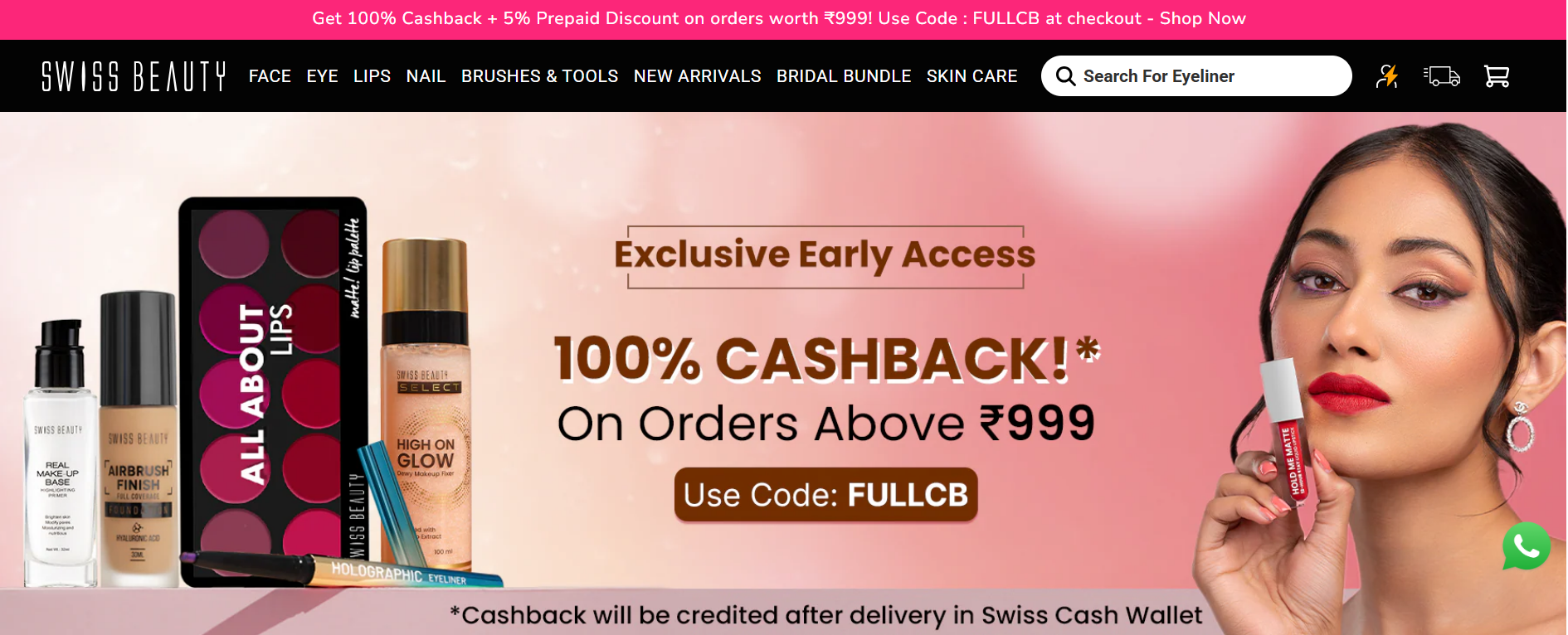 Swiss Beauty, one of India’s fastest-growing beauty brands, brings trend-led cosmetics that blend affordability with quality. The brand’s current offers include Flat 30% OFF + 30% Cashback on orders above ₹999, up to 50% off on curated bundles and kits, and the popular Face of the Day Kit at 35% off, plus an extra 5% discount on prepaid orders, making it a go-to choice for budget-conscious beauty shoppers.