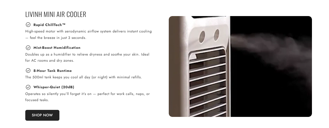 LivinH Mini Air Cooler is a compact, energy-efficient cooler perfect for home or office use. It’s whisper-quiet (20dB), runs up to 8 hours, has dual mist and fan modes, and comes with a 30-day return policy. Its high-quality design makes it easy to promote on social media and other online channels.