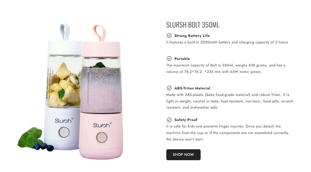 Slursh Bolt 350ML is a portable blender that blends in seconds. It has a long-lasting USB-rechargeable battery and is safe to use while traveling. Its compact design makes it easy to promote on social media and other online channels.